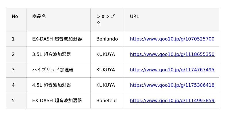 インターネット総合ショッピングモール「Qoo10」を運営するeBay Japan合同会社(本社:東京都港区、代表取締役:グ ジャヒョン)は、「加湿器」の販売数TOP5*を発表いたします。
