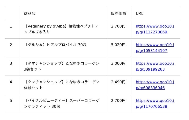 https://www.qoo10.jp/) サイト上「コラーゲン」カテゴリーより販売個数に基づいたランキングです。