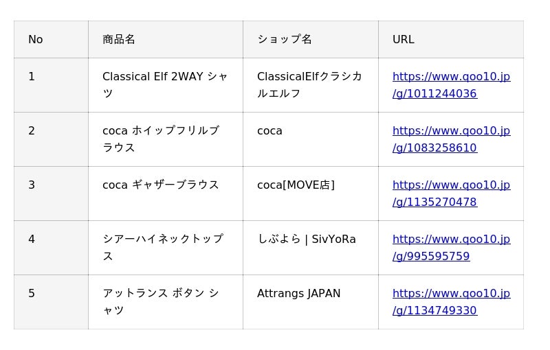 Qoo10(https://www.qoo10.jp/)サイト上、「シャツ・ブラウス」カテゴリーの各販売個数に基づいたランキングです。