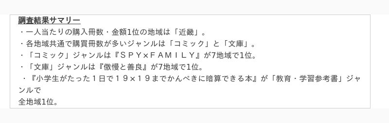 全地域で5位圏内に入ったジャンルごとに地域ごとの購買トップタイトルを順に見ていきます【コミック(全地域1位)】関東では『呪術廻戦(22)桜島結界−転生−』が、それ以外では『SPY×FAMILY(10)』が1位です。