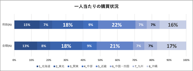 一人当たりの購入冊数・金額人口一人当たりの購入冊数・金額が最も多いのは「近畿」