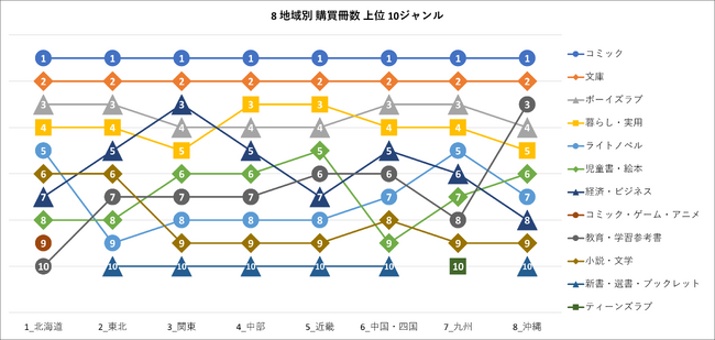3位以降は各地域で順位に変化が見られます。関東は3位に「経済・ビジネス」、沖縄は3位に「教育・学習参考書」、北海道、九州は5位に「ライトノベル」、近畿は5位に「児童書・絵本」が入りました。