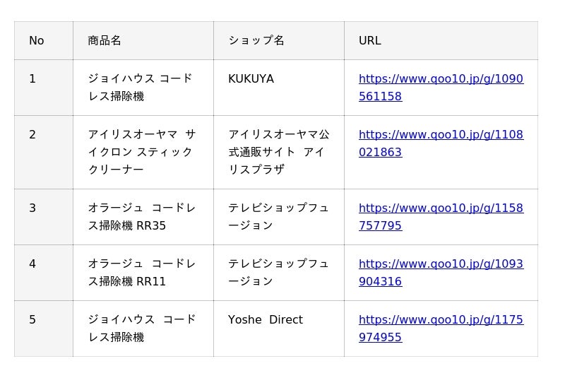 Qoo10(https://www.qoo10.jp/)サイト上、「掃除機」カテゴリーの販売個数に基づいたランキングです。