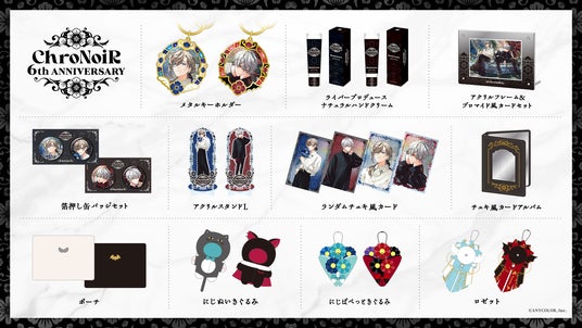 「ChroNoiR 6th ANNIVERSARY」グッズは、ランダムチェキ風カード、箔押し缶バッジセット、アクリルスタンドL、アクリルフレーム&ブロマイド風カードセット、メタルキーホルダー、ライバープロデュース ナチュラルハンドクリーム、ロゼット、チェキ風カードアルバム、にじぬいきぐるみ、にじぱぺっときぐるみ、ポーチの11種類に、受注商品のピアス/イヤリング、アクセサリーケース、腕時計の3種類を加えた計14種類の豪華ラインナップとなります。