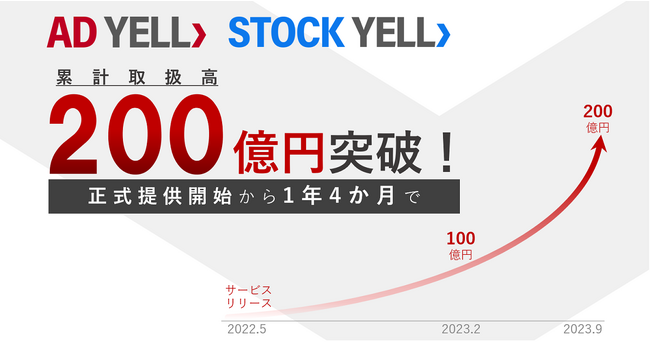2022年5月に正式提供を開始した「AD YELL」は、サービス正式提供開始から9か月後の2023年2月末時点でGMV100億円を突破。その後、さらに成長速度を早め、100億円突破から7か月が経過し、正式提供開始から1年4か月を迎えた今年9月末時点でGMV200億円を突破いたしました。これは、