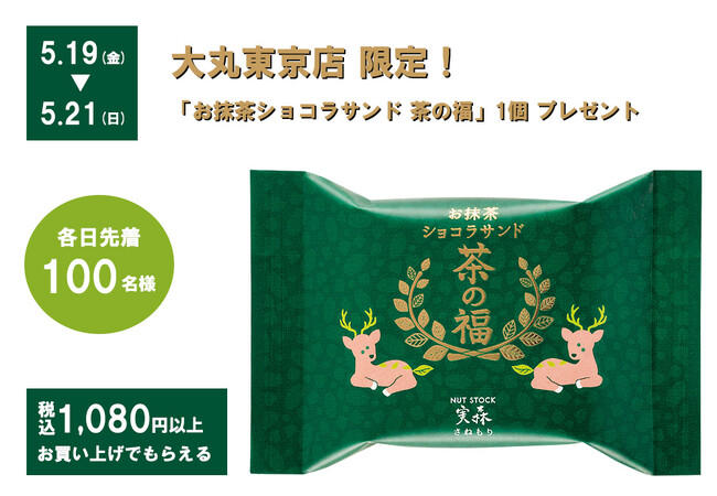 5月19日(金)~21日(日)の3日間限定!「ナッツトック 実森 大丸東京店」にて、税込1,080円以上ご購入いただいたお客様には「お抹茶ショコラサンド 茶の福」を1個プレゼントいたします。各日先着100名様までの特別企画です。ギフトやおやつをお探しの方、大丸東京店にお越しの際はぜひお気軽にお立ち寄りくださいませ。
