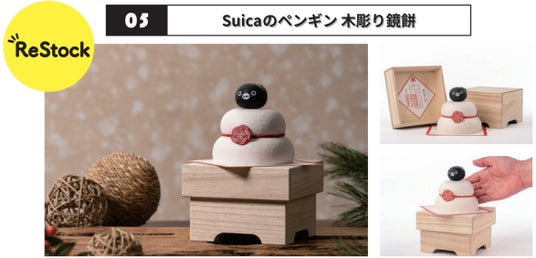 ●商品説明:毎年人気の木彫り鏡餅が数量限定で今年も登場。橙に代わって鎮座した「Suicaのペンギン」のお顔がなんとも愛らしい縁起物。松の内が終われば、三宝を模した台座の桐箱に一式を収納できるので、いつまでも大切にお使いいただけます。原型は仏師の酒井豪が担当し、木彫りの質感を活かした温かみのある造形に仕上がりました。熊本の宝来宝来神社にて金運招来の御祈祷も授かった本格派で、御祈祷の証も付きます。
