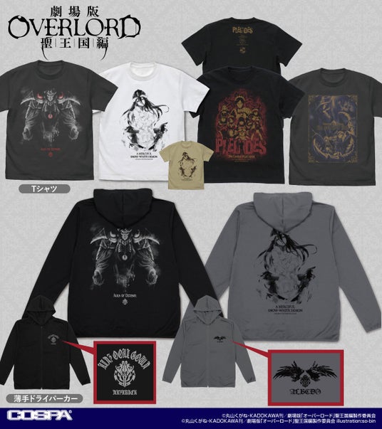 『劇場版「オーバーロード」聖王国編』より、絶望のオーラをモチーフにした一枚「アインズ Tシャツ 絶望のオーラ Ver.」をはじめ、so-bin氏の美麗イラストを使用した「アルベド Tシャツ 慈悲深き純白の悪魔 Ver.」や戦闘メイド隊《プレアデス》たちのTシャツなど、新グッズがCOSPA(コスパ)から登場です。