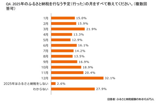 - 2025年のふるさと納税を行う予定(行った)の月は、2024年と同じく「12月(32.1%)」が最も多い一方で、2024年と比較し26.8ポイント少なく、2025年は制度改正を意識した早めの寄付意向がみられます。