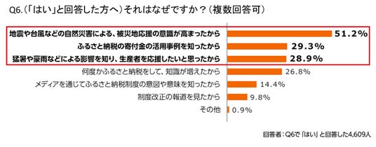 2.「2024年はこれまで以上に地域応援などの制度趣旨を意識した」と回答した人が4割以上、同一被災地域への継続寄付については「寄付したことがある」「今後してみたい」という回答が8割以上(Q5~Q9)- 「2024年はこれまで以上に地域応援などの制度趣旨を意識した」と回答した人は43.2%、その理由として「地震や台風などの自然災害による、被災地応援の意識が高まったから(51.2%)」が最も多い結果となりました。次いで「ふるさと納税の寄付金の活用事例を知ったから(29.3%)」「猛暑や豪雨などによる影響を知り、生産者を応援したいと思ったから(28.9%)」が多く、ふるさと納税を通じた地域支援の広まりがうかがえました。