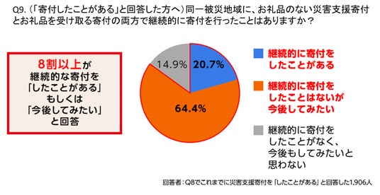 - 災害支援寄付経験者に対する、同一被災地域へのお礼品のない災害支援寄付とお礼品を受け取る寄付の両方での継続的な寄付経験の有無に関する質問では、20.7%が「継続的に寄付をしたことがある」、64.4%が「継続的に寄付をしたことはないが今後してみたい」と回答。災害発生後、時間の経過に伴う記憶の風化が課題とされるなか、ふるさと納税による継続的な支援を意識する寄付者が多いことが分かりました。