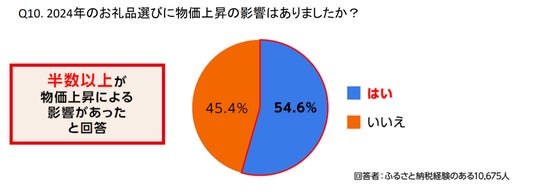 3.物価上昇の影響を受けたと感じる人が半数以上を占め2023年調査(※2)から1割増加し、物価上昇の影響により選ばれたお礼品のジャンル1位は「米・パン」という結果に(Q10、Q11)- 2024年のお礼品選びにおける物価上昇の影響については54.6%が「影響があった」と回答し、同調査を行った2023年(42.4%)を上回る結果となりました。
