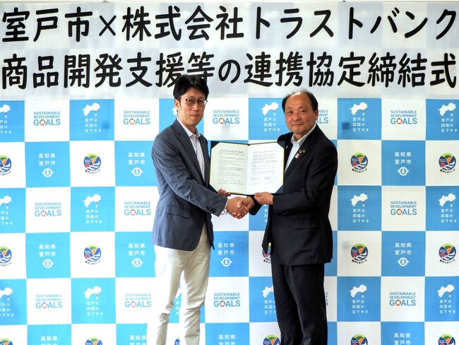 高知県室戸市(市長:植田 壯一郎)と国内最大級のふるさと納税総合サイト「ふるさとチョイス」を企画・運営する株式会社トラストバンク(本社:東京都渋谷区、代表取締役:川村憲一、以下「トラストバンク」)は、本日7 月14 日に商品開発支援等の連携に関する協定を締結いたしました。本協定により、地域の事業者の自立した持続可能な事業運営を推進するため、地場産品を活用した商品開発支援及び販路の提供に協力して取り組みます。