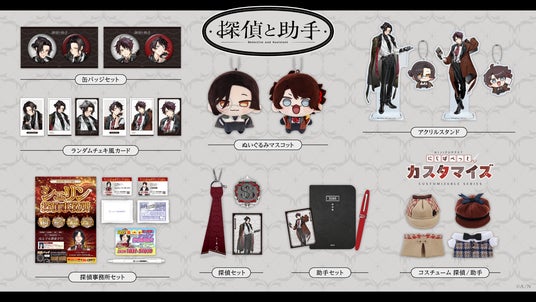 グッズラインナップはランダムチェキ風カード、アクリルスタンド、缶バッジセット、ぬいぐるみマスコット、探偵事務所セット、探偵セット、助手セットの7種類。