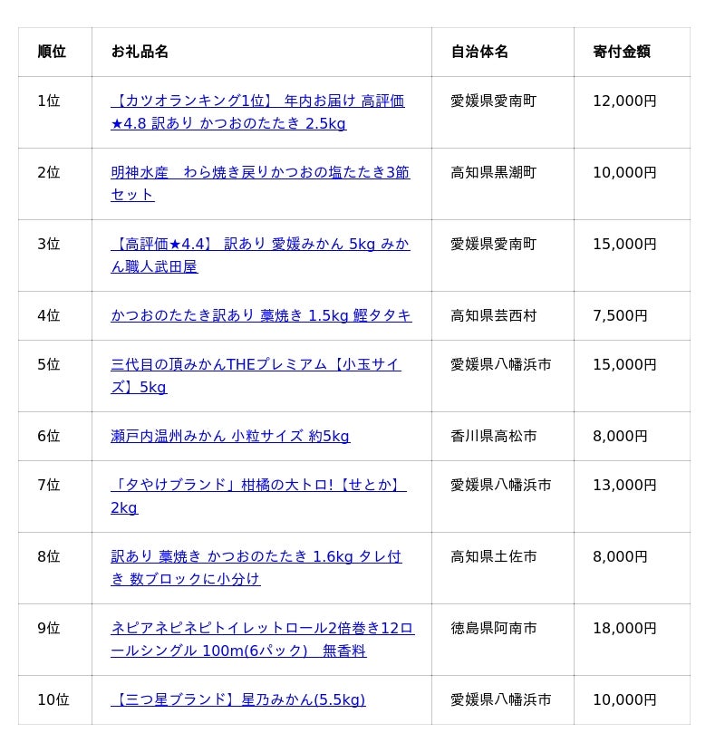 ■<四国版>2025年ふるさと納税人気お礼品ランキング(速報)
