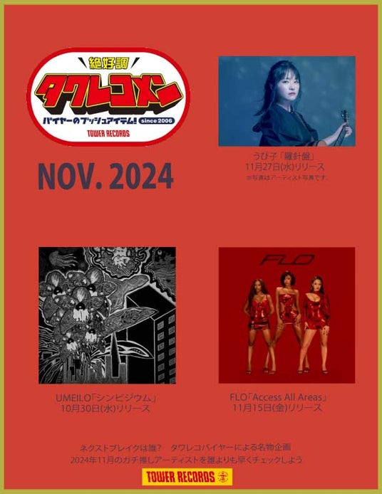 ◆2024年11月度タワレコメン・ラインナップ ※50音順・うぴ子「羅針盤」11月27日(水)リリース・UMEILO「シンビジウム」10月30日(水)リリース ・FLO「Access All Areas」11月15日(金)リリース ※作品詳細は次頁をご参照ください。