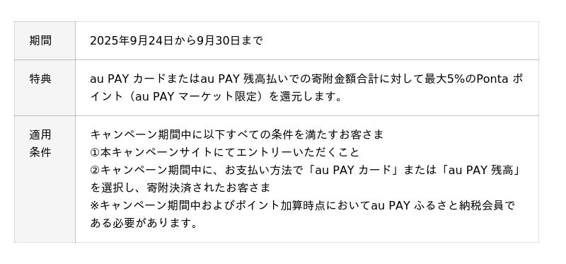 「au PAY ふるさと納税」ラストチャンス カウントダウンウィーク: https://furusato.wowma.jp/announce/campaign_250924/「au PAY マーケット」秋トク!クーポン祭:https://wowma.jp/event/media/lp01■「au PAY ふるさと納税」ラストチャンス カウントダウンウィークについて1.特典概要