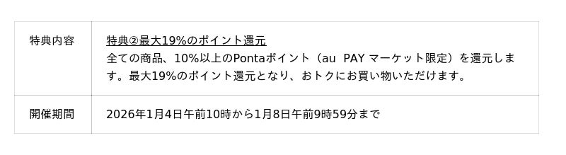 KDDIは、2026年1月1日から1月8日までの期間中、新春恒例のおトクなセール「新春ポイント超超祭」をau PAY マーケットにおいて開催します。期間中は購入金額や条件に応じて最大7%のPontaポイント(au PAY マーケット限定)を還元し、「三太郎の日(2026年1月3日)」や「お買い物ラリー(2026年1月3日~6日)」の特典を組み合わせることで、最大46%のポイント還元となります。
