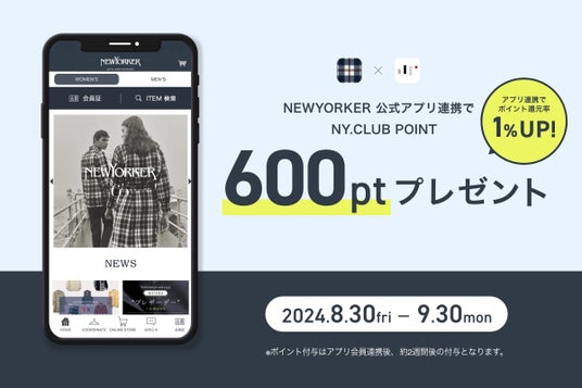 特典:期間中、新規会員登録または、アプリ連携をしていただいた方に、会員プログラム「NY.CLUB」600ポイントをプレゼント。