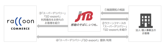 これによりJTBは、ラクーンコマースが運営する、国内メーカーと小売店やサービス業などの事業者が取引する卸・仕入れサイト「スーパーデリバリー」と、その越境版「SD export」を越境ECによる取引先を求めるJTB の法人顧客に紹介します。