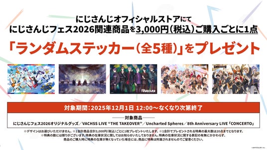 さらに、にじさんじオフィシャルストアにて「にじフェス2026特集」タグがついている商品を3,000円(税込)購入ごとに「ランダムステッカー(全5種)」1点をプレゼントするキャンペーンも実施いたします!
