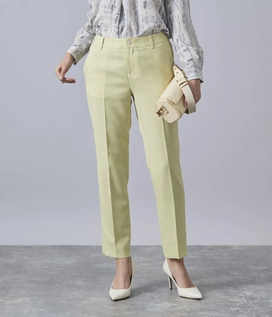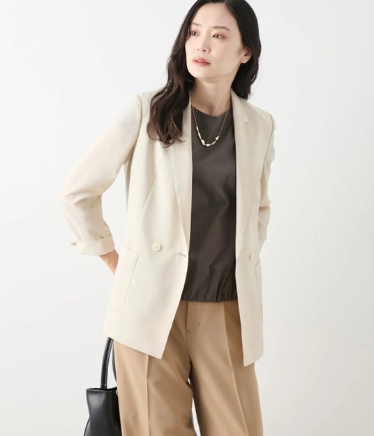 堅い印象に見えがちなジャケットスタイルは、ナチュラルカラーで優しい表情に。パンツはセンタープレス入りのストレートシルエットで、きちんと感がありながらもドライなタッチが汗ばむ季節に嬉しいアイテムです。差し色にしたグリーンのコットンカーディガンは、オフィスでの冷房対策にも。