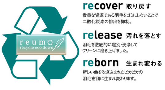 ディノス のSDGsへの取り組みとして生まれたオリジナルのリサイクルダウンブランド「reumo(リウモ)」は、一度役目を終えた羽毛を再利用することで誕生しました。recover(取り戻す)、release(汚れを落とす)、reborn(生まれ変わる)の3 つがキーワードです。