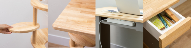 ネコタワーのステップは好みの向きに動かせます。デスクの角は丸みをもたせて仕上げました。天板奥に配線穴があり、背面には電源タップ置き場も。デスク右には引き出し付き。