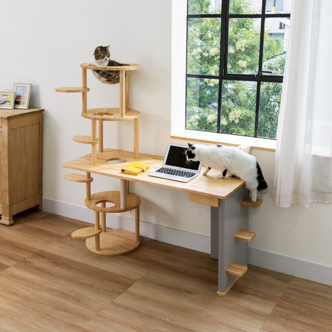 いつでもそばに愛猫の存在を感じていたい方におすすめするデスクです。天然木素材のデスクにネコ用のタワーがドッキング。サイドの階段ステップからデスクに昇ってきたネコが目の前を横切って、タワー最上階のドームでのんび