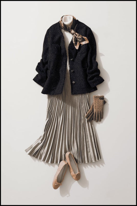 ネイビーのツィードジャケットに、揺らめくプリーツスカートを合わせて。スカーフとグローブを効かせた、細部まで洗練された装い。足元のニュアンスカラーが、全体をやわらかくまとめます。
