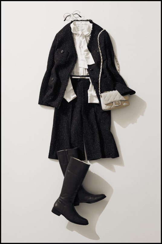 ツィードの表情が引き立つセットアップスタイル。揺れるボウタイがクラシカルな魅力を添え、動きのある着こなしに。ロングブーツでまとめれば、冬らしい深みのあるフェミニンルックが完成します。