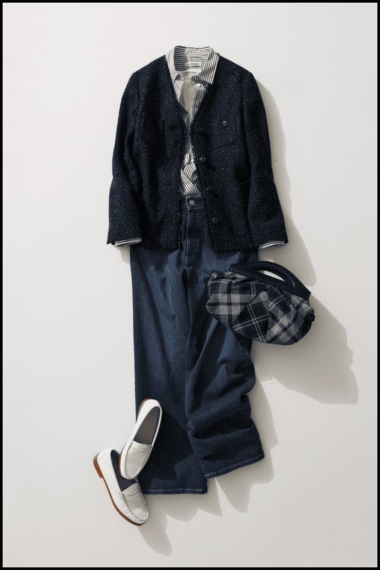 ツィードジャケットをデニムに合わせて、きれいめとリラックスを両立。ストライプシャツが爽やかな抜け感を生み、軽快な印象に。ニューヨーカータータンのバッグをアクセントに、こなれ感のあるデイリースタイルへ。