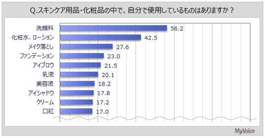 女性では「洗顔料」「化粧水、ローション」が8~9割、「メイク落とし」が6割強、「ファンデーション」「アイブロウ」が各5割強となっています。