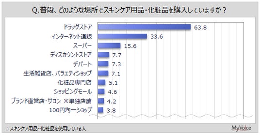 4. スキンケア用品・化粧品の購入場所スキンケア用品・化粧品使用者の購入場所は(複数回答)、「ドラッグストア」が63.8%、「インターネット通販」が33.6%、「スーパー」が15.6%です。