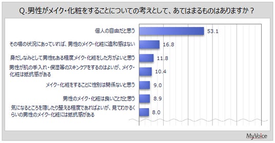 男性がメイク・化粧をすることについての考え方は「個人の自由だと思う」が5割強、「その場の状況にあっていれば、男性のメイク・化粧に違和感はない」が2割弱マイボイスコム株式会社(東京都千代田区、代表取締役社長:高井和久)は、