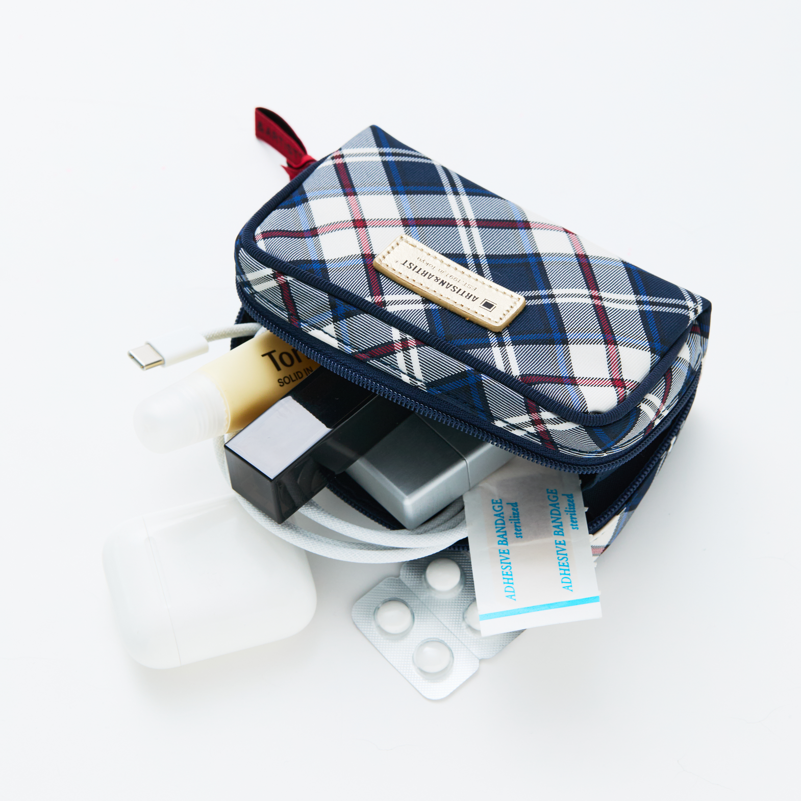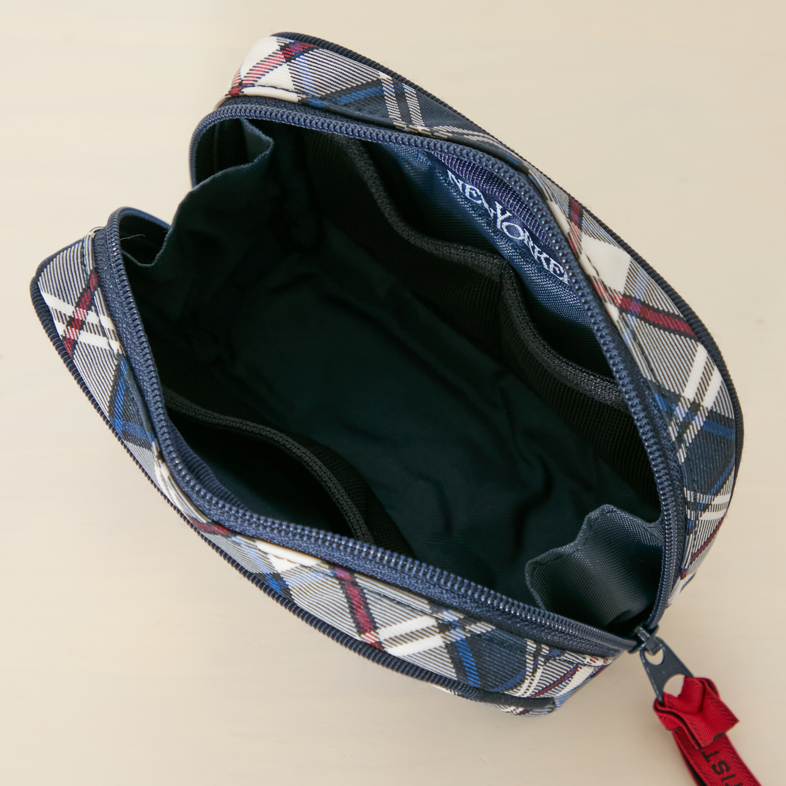 コンパクトなミニポーチ細々したものを収納するのに重宝する小さめサイズ。表地のニューヨーカータータンには弱撥水加工をほどこし、汚れが付きにくく、軽く水拭きが可能です。