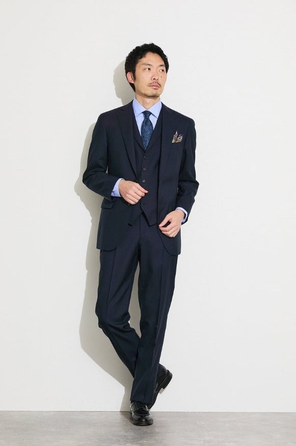 Three-piece Styleベストを加えたスリーピーススーツスタイル。端正なネイビーカラーが洗練された大人の品格を演出します。サックスブルーのシャツにペイズリー柄タイを合わせ、胸元に奥行きをプラス。ビジネスからフォーマルシーンまで対応する、洒脱なスタイリングに仕上げました。