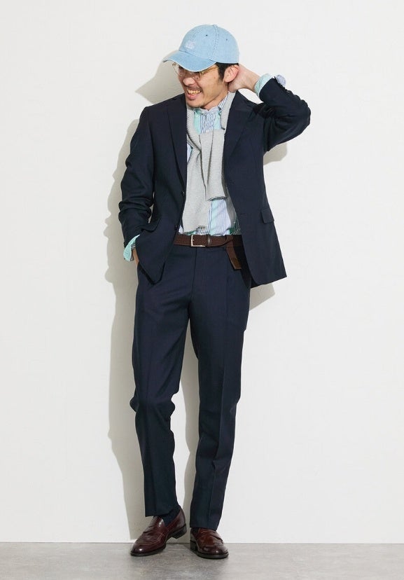 https://www.ny-onlinestore.com/shop/g/g15908074-2026?utm_source=newssite&utm_medium=prCasual-down Styleかっちりしたセットアップにサッカー素材のストライプシャツを合わせ、キャップと肩掛けニットで程よくカジュアルダウン。ブラウンのベルトとシューズが柔らかな印象を添え、軽快でこなれた雰囲気に。きちんと感を保ちながら、休日のお出かけやリラックスしたシーンにも馴染む新鮮なスタイリングです。