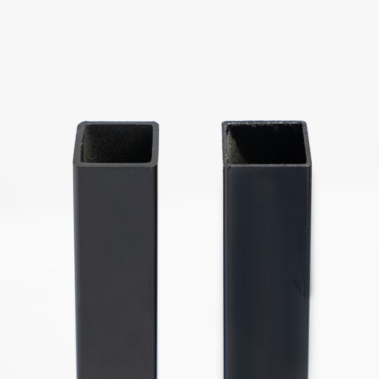 写真(左)1.6mm厚スチール角パイプ。(右)1.2mm厚