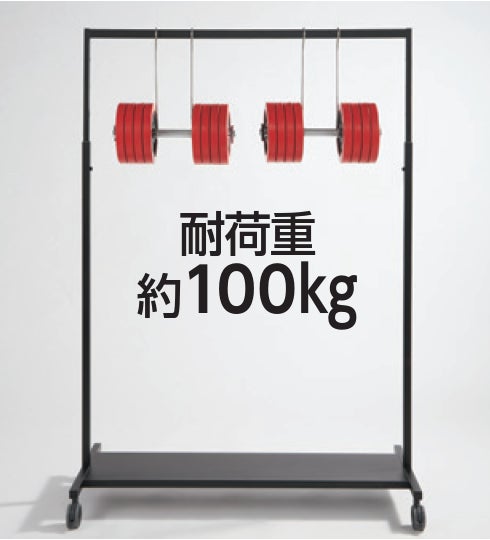 耐荷重の2倍の約200kgの重りをハンガーバーに掛けて荷重試験を行いました。使用上支障のある変形及び破損等の異常発生の有無を目視により確認するとともに、24時間経過後の負荷状態のたわみ率ならびに荷重を取り除いたたわみ率を測定する試験を実施し、クリアしています。