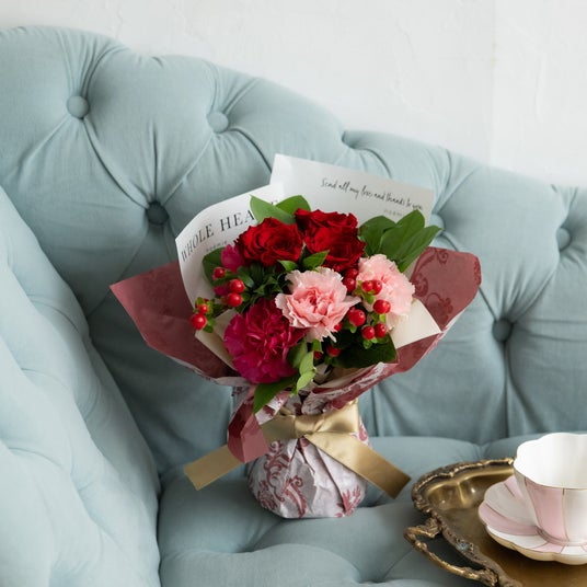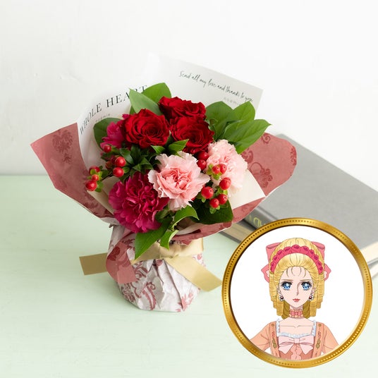 キャラクターをイメージした『咲き続けるバラと生花のブーケ』【マリー・アントワネット】マリー・アントワネットをイメージした赤の『咲き続けるバラ』を中心に、ピンク系の生花のブーケ