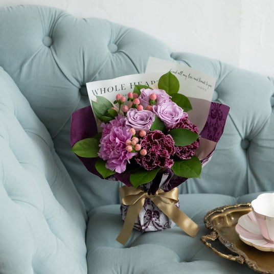 【ハンス・アクセル・フォン・フェルゼン】フェルゼンはパープルの『咲き続けるバラ』を中心に、パープルの生花でイメージしたブーケ