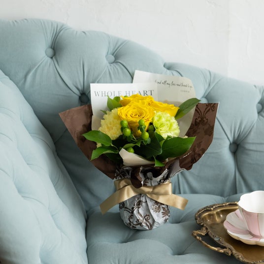 【アンドレ・グランディエ】アンドレはイエローの『咲き続けるバラ』を中心に、イエローの生花でイメージしたブーケ