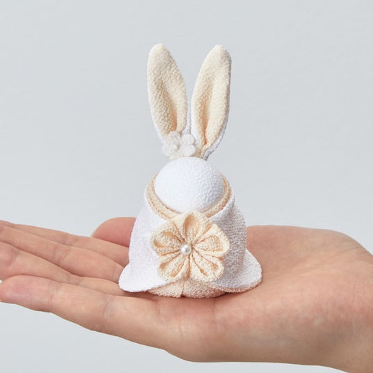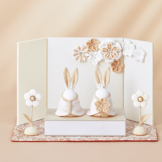 ウサギの愛らしいお雛さまは、インテリアになじむ可愛らしくもすっきりしたデザイン。手のひらにおさまるサイズ感で小さなスペースにも飾ることができます。つまみ細工の花をあしらった屏風と台座、対の花飾りのセットです。(ディノスオリジナルセット)