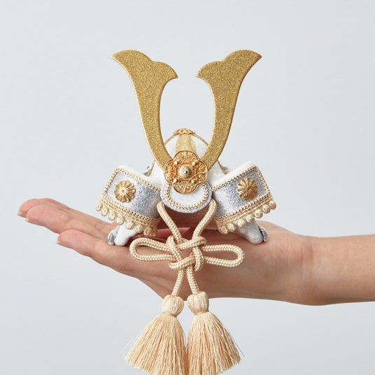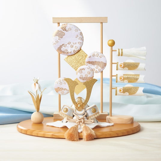 白を基調としたゴールドとシルバーの組み合わせが華やかな端午飾り。兜、几帳、こいのぼり、菖蒲、敷台のセットです。几帳に配された和柄が趣のあるアクセントになっています。(ディノスオリジナルセット)