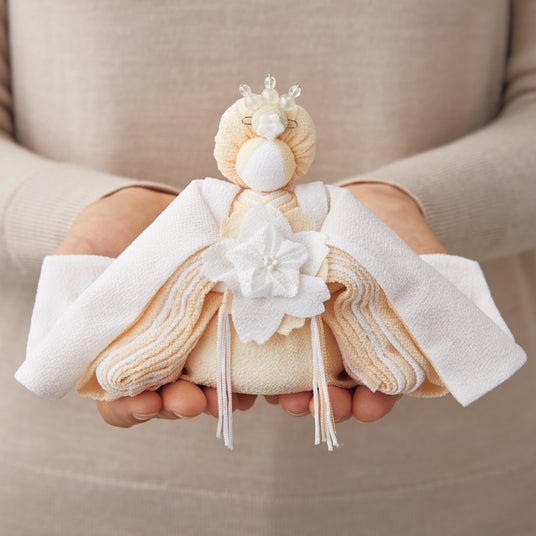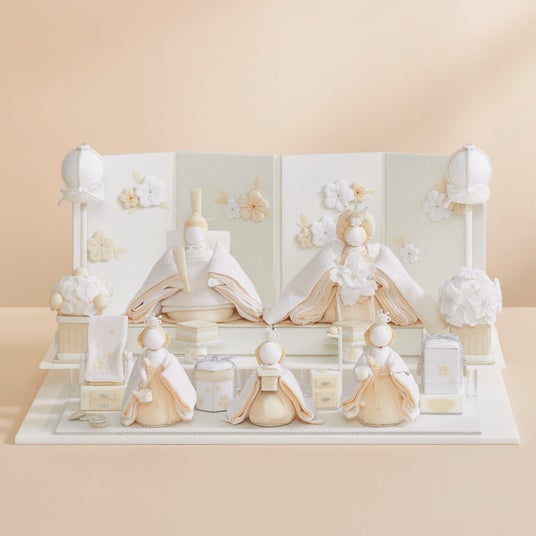 京都の職人の繊細な手仕事から生まれるモダンなデザインの雛飾り。十二単のイメージで丁寧にちりめんを折り重ねた、お雛さまの優美な衣装にこだわりがあります。あえて白を基調とすることで、布の質感や装飾の陰影が印象的な仕上がりになっています。素朴で豊かな、今までにない新しい美しさが魅力的なお雛様です。花をあしらった屏風、シンプルながら素材感が愛らしいぼんぼり、桜橘の花飾り、鏡台や重箱などのお道具も細やかな仕上がりです。ディノスオリジナルセットです。