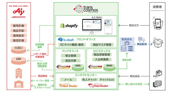 トランスコスモス株式会社(代表取締役共同社長:牟田正明、神谷健志)は、味の素グループにShopifyを基軸としたD2C ECモール「AJI MALL」の構築およびEC運用を提供しました。モール型のサイト構成やブランド別コンテンツの制作に加え、共通ID基盤「AJINOMOTO ID」の会員情報連携、実積データのERP連携、CRMツール「b→dash」連携を行い、味の素グループの各種D2Cブランドの世界観を発信できる環境と体制を構築しました。