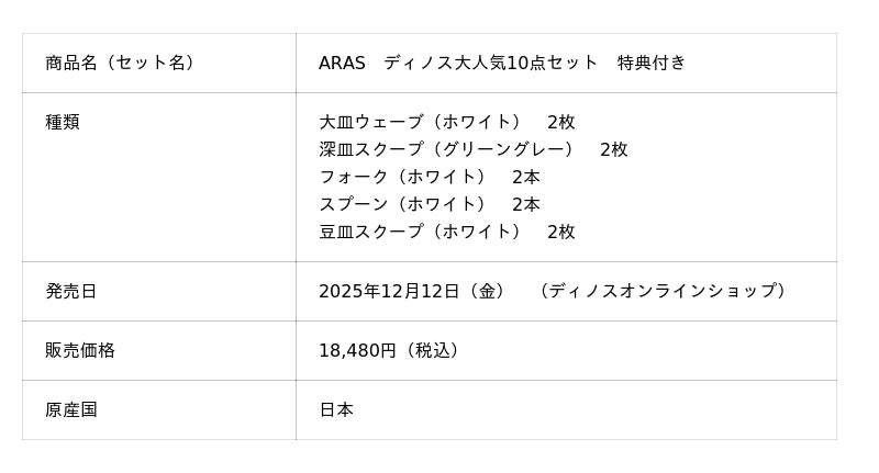 株式会社dinos(本社:東京都中野区、代表取締役社長:加藤 浩輔)は、1000回落としても割れない食器ブランド「ARAS(エイラス)」シリーズから、当社で厳選したアイテムを盛り込んだ「ディノス大人気セット」を『ディノスオンラインショップ』で発売しました。ARASの中でも人気の高い「大皿ウェーブ」や「深皿スクープ」など基本的なラインアップをそろえたものと、それらに加え茶碗や取り皿など豊富なバリエーションをそろえた2種類のセットを用意。2026年1月12日(月)まで送料無料でお届けいたします。