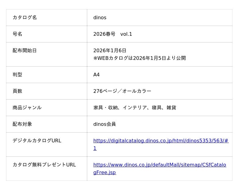 株式会社dinos(本社:東京都中野区、代表取締役社長:加藤 浩輔)は、基幹カタログ『DINOS STORY』を『dinos』にリニューアルし、2026年1月6日より配布を開始しました。リニューアルは当社の新ブランドメッセージ「わたしの『好き』、みつけた。」に基づいたリブランディングの一環で、従来の総合通販カタログのイメージから脱却し、洗練されながらも温かみのある誌面へ刷新しました。