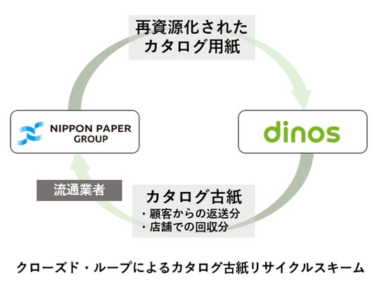 当社は資源の国内循環の推進を目的に、運営する通販ブランド「ディノス」のお客さまへ配布したカタログのうち、不要となったカタログを回収し再資源化しています。本キャンペーンは、2025年9月~12月に実施した前回の回収企画が好評だったことを受け、カタログの店舗への持ち込み冊数に関わらず一律(1枚500円分)だったクーポンの配布枚数を、持ち込み冊数に応じて枚数が増える内容へと拡充します。回収したカタログは、カタログ用紙調達先である日本製紙株式会社(本社:東京都千代田区)と連携した「クローズド・ループ」による古紙リサイクルスキームを通じて、再生資源として活用いたします。